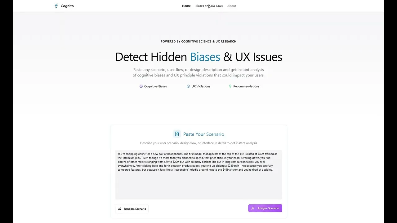 The idea for Cognito started while I was writing a blog on cognitive biases in UX. I wanted to create a resource that made it easier for designers to spot these hidden pitfalls. Around the same time, Figma and Contra announced their Make-a-Thon, a contest encouraging designers to experiment with their new Vibe Coding AI tool. I took this as an opportunity to explore how Vibe Coding could fit into my workflow and challenged myself to integrate AI into my design workflow.